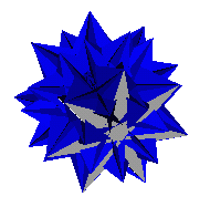 In similar fashion to the snub anti-prisms, a family of polyhedra also exists which is isomorphous to the bi-snub anti-prisms. This family also has starred vertices. An example of this family, which I term "great bi-snub anti-prisms", is the 7/3 great bi-snub anti-prism shown above left. Again, the great icosahedron is a member of this family as the "digonal great bi-snub anti-prism" in the same way that the icosahedron is the "digonal bi-snub anti-prism". Models can also be generated with n/d<2, in this case the base polygon becomes retrograde which has the effect of partially un-crossing the type "A" vertices. For example, the 7/4 great bi-snub anti-prism (above right) and this 5/3 great bi-snub anti-prism.Examples of the family