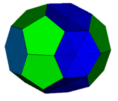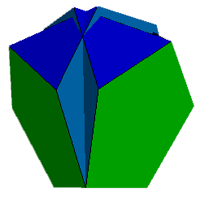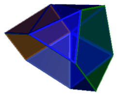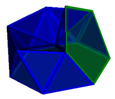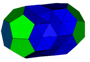 This 6-5-3 near miss was discovered by myself in 2005. It was an attempt to solve the 6-5-3 acron by following Mason Green's methodology by which the 7-7-3 acron was solved. The distortion is restricted to the triangular faces. (Stress map). Distortion: (E=0.106, P=0, A=23.3°)
