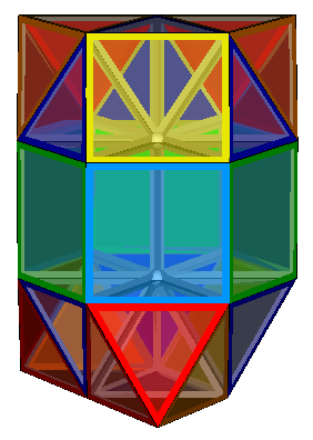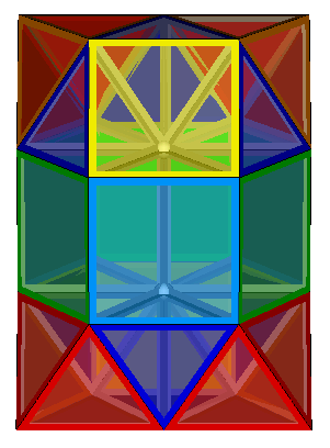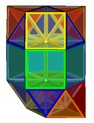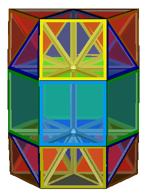 The four honeycombs described on the previous page, 10Y4-8T-n, 10Y4-8T-ortho, 10Y4-8T-meta and 10Y4-8T-para can also be elongated by the insertion of layers of triangular prisms between each layer of pyramids and tetrahedra. The four equivalent honeycombs then become 5Y4-4T-6P3-tri-n, 5Y4-4T-6P3-tri-ortho, 5Y4-4T-6P3-tri-meta and 5Y4-4T-6P3-tri-para. The insertion of the 'tri' in the name is to distinguish these from the previously discussed 5Y4-4T-6P3-sq-ortho and 5Y4-4T-6P3-sq-gyro formed from layers with square faces exposed.