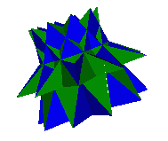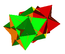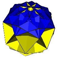 This polyhedron is made up of two 5/2-anti-prisms (red and green) and two 5/2 crossed anti-prisms (orange and yellow) arranged as follows: a 5/2-anti-prism is placed next to a 5/2 crossed anti-prism such that one pentagrammic face of each coincide. This process is repeated with the other two constituents to form a second similar solid. This is placed over the original solid such that the two open ends of each solid coincide and the open end of the 5/2 crossed anti-prism of the second solid is coincident with the open end of the 5/2-anti-prism of the first. It has the unusual property that all vertices are of the form {3,6}. This polyhedron was first described by Dr Richard Klitzing who has since generated this 7/3-gonal equivalent. Such blends are possible for all n/d-gonal anti-prisms with 2 < n/d < 3