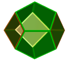 The Edshammar figure is referred to as 11E in [2]. This paper also discusses further figures (generalized Edshammar polyhedra) such as 14E (above right) (VRML, OFF) and other figures of the form 5+3nE with n>=1. 8E is the cube. All figures with n>=4 contain coplanar triangles. All members of the family are space-fillers with members up to 17E occurring naturally. 14E has deformation (E=0.569, P=0, A=126.3°). Stress map. Note how the square faces are in different alignments between members of the form 5+3nE where n is odd (such as 11E) and those where n is even (such as 14E).