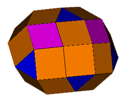 Commentary: The Expanded Rhombic Dodecahedron ('XRD') can be produced from the Rhombic Dodecahedron by a process of expansion. Each face of the Rhombic Dodecahedron is moved outwards until there is a distance of one unit between each originally adjacent face. These gaps are filled by the insertion of square faces. The remaining holes, corresponding to the original vertices of the Rhombic Dodecahedron can be filled by triangles and further squares. This figure can also form the basis of an interesting toroid.
