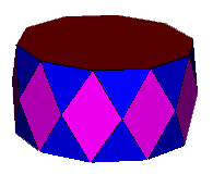 Commentary: The decagonal square barrel was discovered by Roger Kaufman and is one of an infinite family of polyhedra containing rhombic faces. Only the decagonal form contains golden rhombi. (See also the hexagonal square barrel). The decagonal square barrel can have one or both of its decagonal faces augmented with a pentagonal cupola. Despite appearances, it cannot be augmented with a pentagonal rotunda as the edge adjacent triangular faces become coplanar.