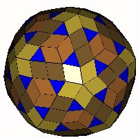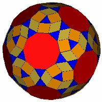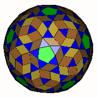 ![]() Stellated Faceted Zonish Snub Icosidodecahedron (Type A) (a1=61.596°, a2=70.529°, a3=68.119°): Discovered by Roger Kaufman in 2014.Take the Faceted Zonish Snub Icosidodecahedron (Type A) and stellate the pentagonal faces to form complexes of 5 rhombi. Relax the model. Note that the 'brown' rhombi are golden rhombi. OFF |