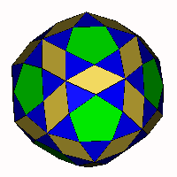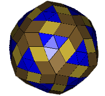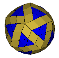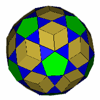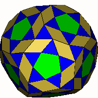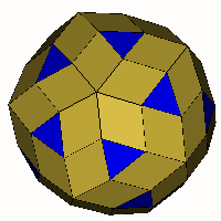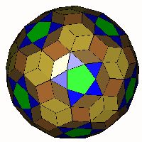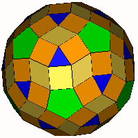 ![]() 'Snub' Rhombic Triacontahedron (a=62.967°) Take an expanded rhombic triacontahedron, divide each square into two triangles and allow to relax. Note the rhombi are different to those in the original rhombic triacontahedron. OFF