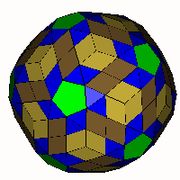 ![]() Tetra-linear rhombic polyhedron. (a1=73.531°, a2=68.789°, a3=60.533°). Following the sequence of the rhombi-propello-icosahedron (with rhombi in lines of 2) and the rhombified stellated snub rhombic triacontahedron (with rhombi in lines of 3) comes the above polyhedron with rhombi in lines of 4. The hexagonal faces formed by the subdivision of the triangular sections are themselves subdivided into complexes of three rhombi. OFF |