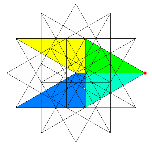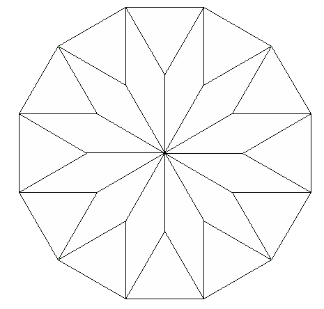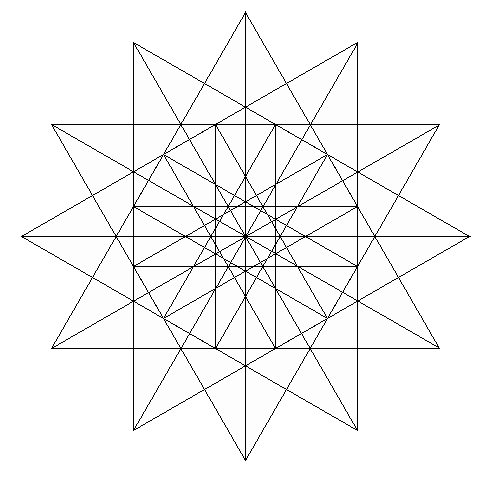 The acute angles of the rhombi are interesting. For the triangular molybi-pyramid, the rhombi have an acute angle of 60° - and can be thought of as two coplanar triangles. For the pentagonal molybi-pyramid, the rhombi have an acute angle of 36°. There is also a pentagrammic molybi-pyramid where the rhombi have an acute angle of 72°. These, along with the limiting cases, appear to be the only rational values of n/d which produce rational rhombi angles. Two other cases are easy to derive explicitly, the square molybi-pyramid has rhombi with an acute angle of 41.4096° [ 2.tan-1(1/sqrt(7)) ] , and the hexagonal molybi-pyramid has rhombi with an acute angle of 33.5573° [ 2.tan-1(1/sqrt(11)) ].