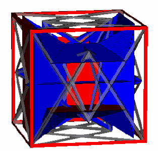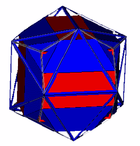 The above images show snapshots from two animations of segmentochora. The left image is an animation of cube || icosahedron, the right image is cube || great icosahedron. (Note that this is not included in Dr Klitzing's set of Convex Segmentochora as it is not convex, a 'still' model of this segmentochoron is here). The animations show the appearance of the segmentochoron at differing three dimensional realms as the viewpoint is moved from one polyhedral 'cap' to the other, the exterior framework of the segmentochoron is retained though. Clicking on either image will lead to the animated file.