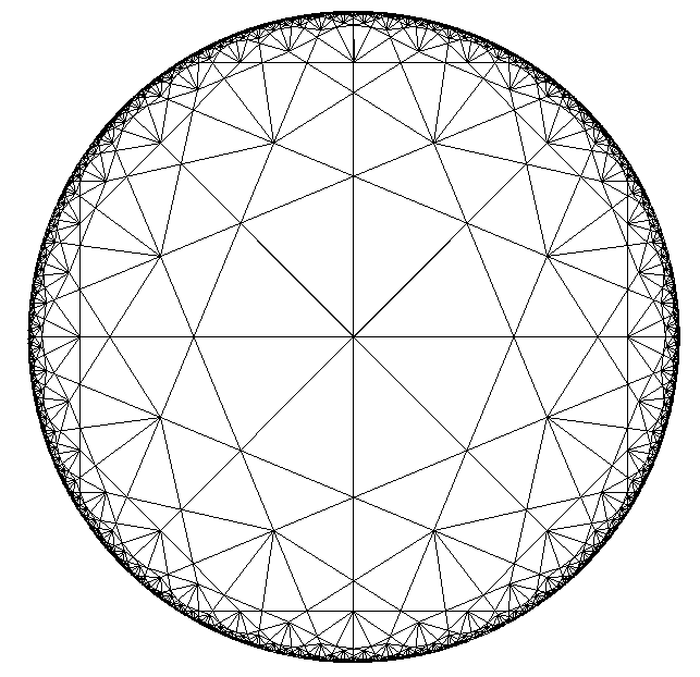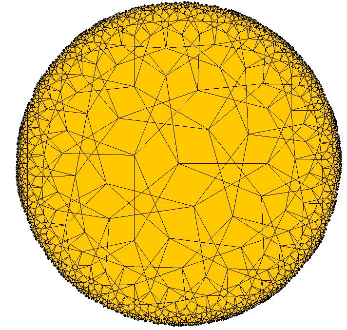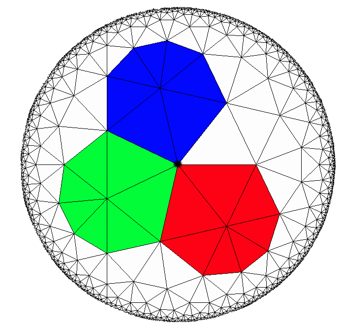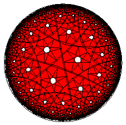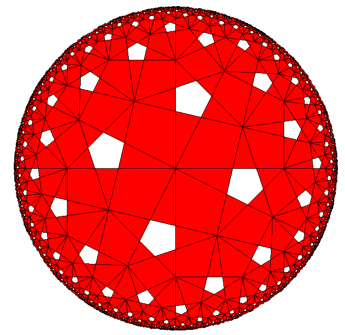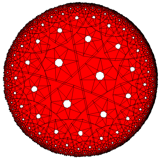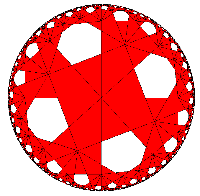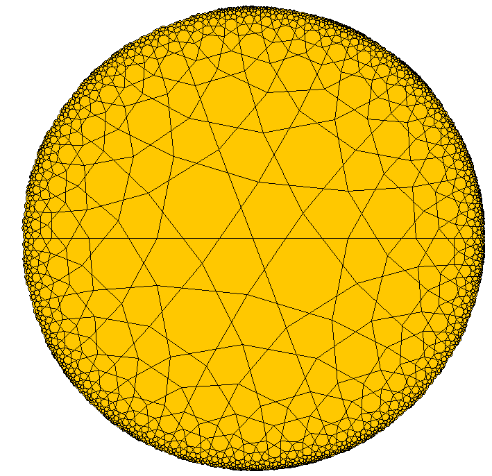 The above image shows a {7/2, 7} tessellaton. The notation {p,q} meaning that q p-gons are arranged around each vertex. A regular tessellation of the form {p/2, p} exists for all p>=7 where p is odd. It may not be easy to see the pattern of 7/2-gons from the above image, in which case a second image is presented here which has one vertex and its surrounding 7/2-gons highlighted. Note that as the dual of a {p,q} is a {q,p} then tessellations also exist of the form {p, p/2} i.e. p p-gons wrapped twice around each vertex - the grid for the {p, p/2} is the same as that for {3, p} - e.g. this {3,7} contains {7, 7/2}..