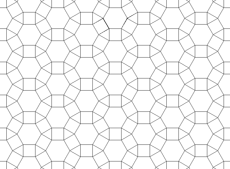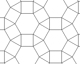 The above familiar edge network is easily recognisable as that of the 6,4,3,4 tessellation. However, there are a further two tessellations sharing this network as can be seen below. Both of the additional tessellations involve retrograde polygons: