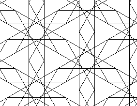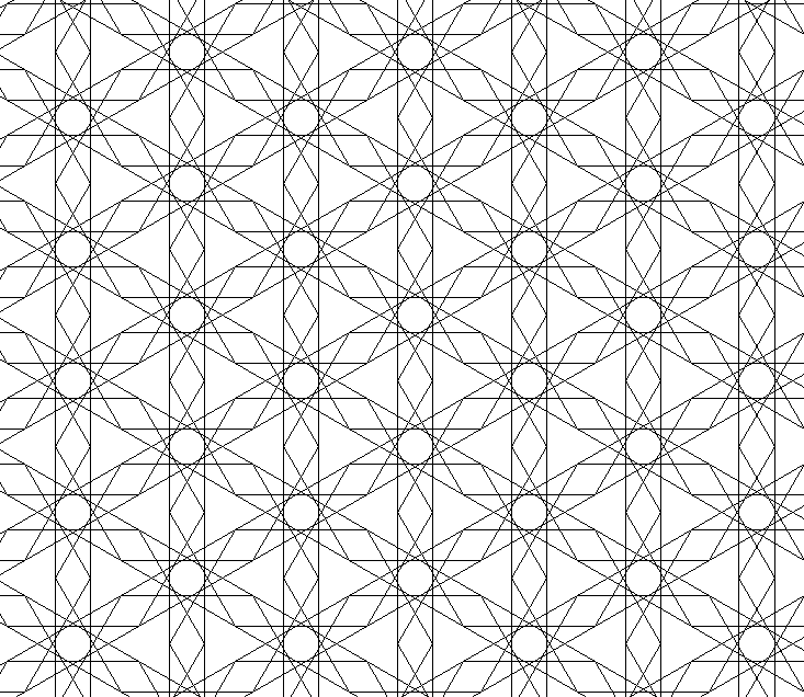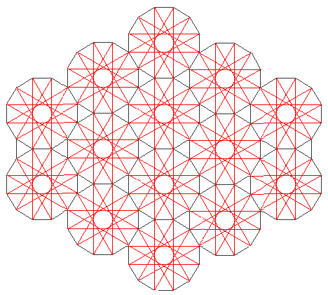 The above edge network is formed in a similar fashion to the Type 2 network. In this case the faceting is of the cells of a 12, 12, 3 tessellation, replacing each dodecagon with a dodecagram (a 12/5-gon) where the vertices of the dodecagram are superimposed on the vertices of the original dodecagon. A copy of this network superimposed on the original 12, 12, 3 tessellation is linked here.