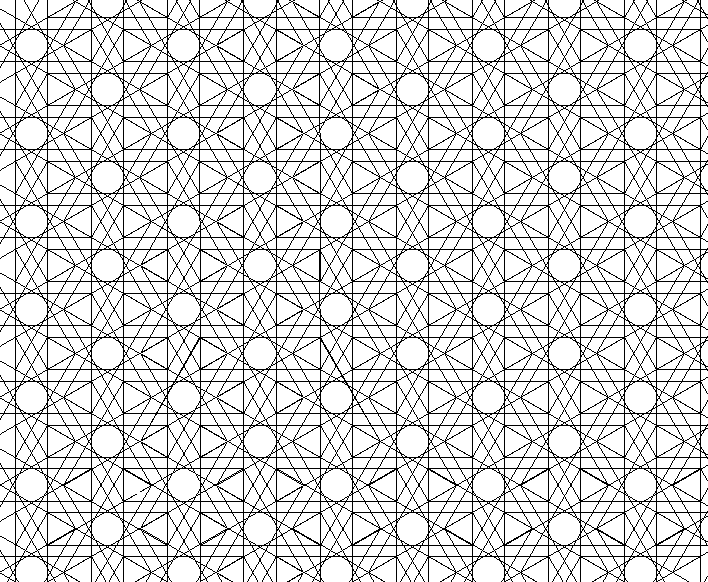 The above edge network is a faceting is of the dodecahedral cells present in a type 1 network (home to the 6, 4, 3, 4 tessellation). A copy of this network superimposed on the original 6, 4, 3, 4 tessellation is linked here. Alternatively, this network can be regarded as a quasi-stellation of a 12, 12, 3 tessellation, replacing each dodecagon with a dodecagram sized such that the outside parallel edges of the dodecagram are one unit apart, as in the diagram below showing a square face highlighted.