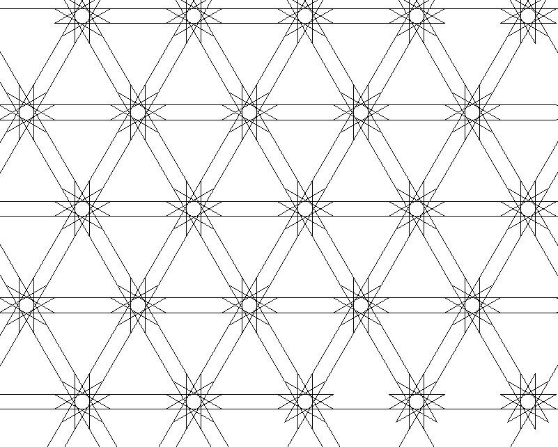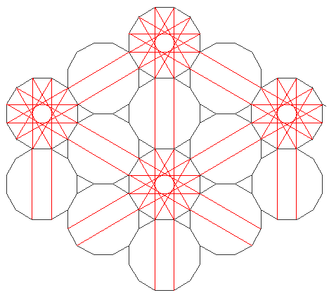 The above edge network is a faceting is of the cells of a 12,12,3 tessellation, dodecagons are faceted such that faceted dodecagons are separated by an unfaceted dodecagon. A copy of this network superimposed on the original 12, 12, 3 tessellation is linked here.