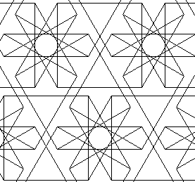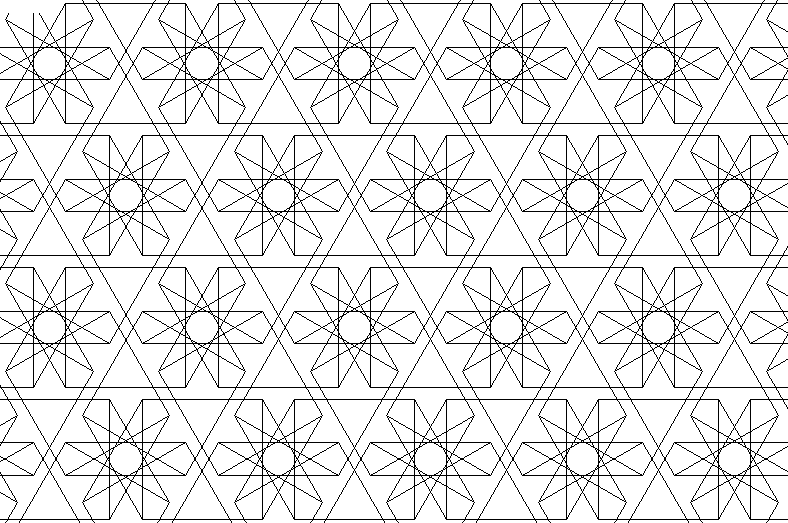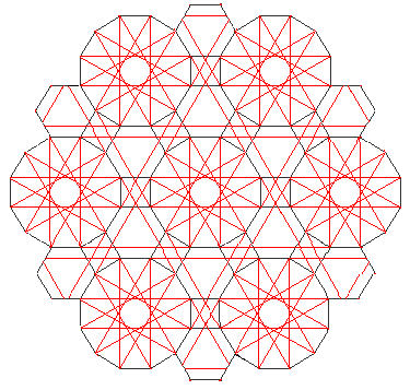 The above edge network is a faceting is of the dodecagons in a 12, 6, 4 tessellation. A copy of this network superimposed on the original 12, 6, 4 tessellation is linked here. An alternative construction is to facet a 12, 12, 3 tessellation, replacing each dodecagon with an dodecagram sized such that the neighbouring parallel edges of the dodecagrams in neighbouring dodecagons are one unit apart.