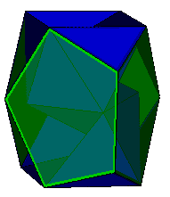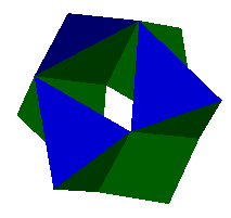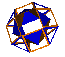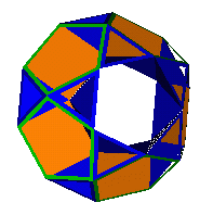 To start, two toroids that are NOT Stewart Toroids. They are not quasi-convex and they also break the non-intersecting face rule. They are included here as with just 12 faces, I believe them to be the least faced toroids that can be generated with regular faces. The least faced Stewart Toroid ( Q3P6 / P3Q3 - see third image below) has 21 faces. The first of the 12 faced toroids (left hand image) consists of two hexagonal prisms, one gyrated with regard to the other. Using Stewart notation it is a P6 / gP6. The second (right hand image) (solid, frame) is a faceting of the icosahedron, discovered by Dr Richard Klitzing during a systematic search of such facetings. This second toroid also appears to be the toroid with the least vertices, having just 12. More of Dr Klitzing's images are hosted by Ulrich Mikloweit here