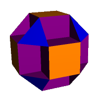 Each triangular face of the small cubicuboctahedron can be excavated with a snub cuboctahedron, vertex figure (4,3,3,3,3) completing a cycle around the axis. The octahedral triangular face is used for the excavation. This has the effect of uncrossing the original vertex figure. The 3/2 in the vertex figure is replaced by (3,4,3,3) The original vertex figure becomes (4,8,3,4,3,3,8)/2 with new vertices of (4,3,3,3,3). Triangular and square faces of the snub cuboctahedron are shown in blue and yellow respectively. All vertices are on the exterior of the polyhedron.