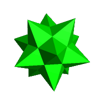 Left: Another augmentation of the small stellated dodecahedron can be obtained by excavating each pentagrammic face with a great icosidodecahedron - vertex (5/2,3,5/2,3) - completing a cycle around the axis. The 5/2's in the vertex figure are each replaced by (3,5/2,3) The original vertex figures become (3,5/2,3,3,5/2,3,3,5/2,3,3,5/2,3,3,5/2,3)/4 or ((3,5/2,3)5)/4 with new vertices of (5/2,3,5/2,3). All vertices are on the exterior of the figure.