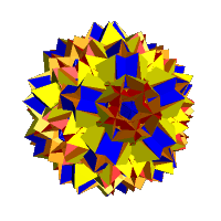 Centre: A second order augmentation can be formed from the above polyhedron by excavating the pentagrammic antiprismatic caps with 5/3-cupolas. The cupolas themselves are not locally convex but the act of joining them to the pentagrammic caps removes the retrograde polygon. The original vertices of (315)/4 are unaffected. The 5/2 in the (5/2,3,3,3) vertices is replaced by (4,3,4)/2 to give (4,3,4,3,3,3)/2 vertices. New vertices are added of the form (10/3,3,4). Colours are as per the previous polyhedron with the 5/3-cupolas shown in red/orange/yellow. All vertices are on the exterior of the polyhedron.