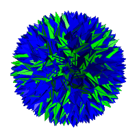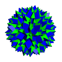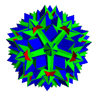 Right: A further augmentation of the small stellated dodecahedron can be obtained by excavating each pentagrammic face with a great retrosnub icosidodecahedron - vertex (5/2,3,3,3,3)/2 - completing a cycle around the axis. The 5/2's in the vertex figure are each replaced by (3,3,3,3) The original vertex figures become (3,3,3,3,3,3,3,3,3,3,3,3,3,3,3,3,3,3,3,3)/9 or (320)/9 with new vertices of (5/2,3,3,3,3)/2. All vertices are on the exterior of the figure.