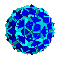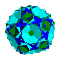 Each triangular face of the great icosified icosidodecahedron can be excavated with a truncated tetrahedron - vertex figure (6,6,3) - completing a cycle around the axis. This has the effect of uncrossing the original vertex figure. The 3/2 in the vertex figure is replaced by (6,6) The original vertex figure becomes (6,6,6,6,5)/2 with new vertices of (6,6,3). The original hexagonal faces of the great icosified icosidodecahedron are shown in red with the hexagonal and triangular faces of the truncated tetrahedron cyan and blue respectively. All vertices are on the exterior of the polyhedron.