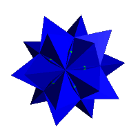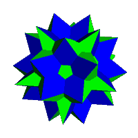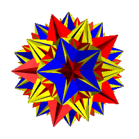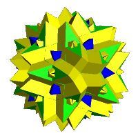 Right: A further augmentation of the great icosidodecahedron can be obtained as follows: Excavate one pentagrammic cap of a crossed pentagrammic antiprism with a pentagrammic pyramid. The resulting polyhedron is equivalent to a diminished great icosahedron. This polyhedron is not locally convex but the act of joining it to the great icosidodecahedron removes the retrograde polygon . Excavate each of the pentagrammic faces of the great icosidodecahedron with a diminished great icosahedron. The 5/2 in the vertex figure is replaced by a (3,3,3)/2 The original vertex figures become (3,3,3,3,3,3,3,3)/3 - or (38)/3 with new vertices from the diminished great icosahedron of (3,3,3,3,3)/2 - or (35)/2. The original triangular faces of the stellatruncated cube are shown in blue, those of the anti-prisms in yellow and the pyramids red. All vertices are on the exterior of the polyhedron.