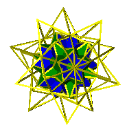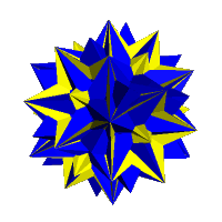 Centre: A further augmentation of the great icosidodecahedron can be obtained by excavating each pentagrammic face with a pentagrammic antiprism which completing a cycle around the axis and each triangular face with a triangular pyramid or tetrahedron which again completes a cycle around the axis. Each 5/2 in the vertex figure is replaced by a (3,3,3) and each 3 in the vertex figure is replaced by (3,3) The original vertex figure becomes (3,3,3,3,3,3,3,3,3,3)/3 or (310)/3 with new vertices of (5/2,3,3,3) and (3,3,3) respectively. The triangular faces of the pentagrammic antiprisms are shown in yellow and the tetrahedral faces in blue. All vertices are on the exterior of the polyhedron.