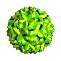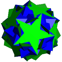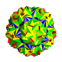 Right: Dr Richard Klitzing has explored the facetings of the small ditrigonal icosidodecahedron. One faceting, which he terms 'sid-6-10-0-2' has the necessary 5-fold pyramidical symmetry around a pentagrammic face and is also locally convex. As the vertices of the sid-6-10-0-2 are a subset of the vertices of the small ditrigonal icosidodecahedron then excavating each pentagrammic face of the vertisnub dodecadodecahedron with the sid-6-10-0-2 will also generate a valid augmented polyhedron. The 5/3 in the vertex figure is again replaced by (3,5/2,3,5/2,3). The original vertex figure again becomes (3,5/2,3,5/2,3,3,5,3,3). New vertices are now though of the form (5/2,3,5/2,5) and (3,5/2,3,5). Triangular and pentagonal faces of the sid-6-10-0-2 are shown in yellow and red respectively. The original triangular faces are in blue. All vertices lie on the convex hull.