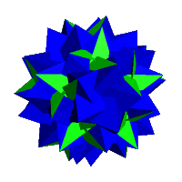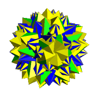 Right: Another augmentation of the great vertisnub icosidodecahedron can be obtained by excavating each pentagrammic face with a great icosidodecahedron, vertex figure (5/2,3,5/2,3) completing a cycle around the axis. This has the effect of uncrossing the original vertex figure. The 5/3 in the vertex figure is replaced by (3,5/2,3) The original vertex figure becomes (4,3,5/2,3,4,3)/2 with new vertices of (5/2,3,5/2,3). The triangular faces of the great icosidodecahedra are shown in yellow. The original triangular faces are blue. All vertices are on the exterior of the polyhedron. Unfortunately I have not yet been able to generate a VRML model of this polyhedron, but clicking on the image above will show a larger image.