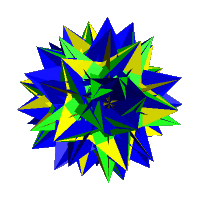 Right (79d): An unusual augmentation of the great retrosnub icosidodecahedron can be obtained as follows. Excavate all but one retrograde pentagrammic face of the small retrosnub icosidodecahedron with a pentagrammic pyramid completing a cycle around the axis (excavating all faces gives an augmented small retrosnub icosidodecahedron). This forms a polyhedron with one retrograde face. I term this a "modified 77a". All vertices not connected to this face are locally convex and of the forms (37)/3 and (35)/2. The vertices containing the retrograde pentagram are of the form (5/3,3,3,3,3,3)/2. Excavate each pentagrammic face of the great retrosnub icosidodecahedron with this modified 77a. The 5/2 in the vertex figure is replaced by (3,3,3,3,3). The original vertices become (3,3,3,3,3,3,3,3,3)/4 or (39)/4 (as in an equivalent augmentation of the small retrosnub icosidodecahedron) with the (37)/3 and (35)/2 vertices of the modified 77a also present. The original triangles of the great retrosnub icosidodecahedron are shown in yellow. The triangles of the small retrosnub icosidodecahedron are in blue and the triangles of the pentagrammic pyramids in green. All vertices are on the exterior of the polyhedron.