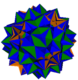 The list of uniform polyhedra was first published by H.S.M.Coxeter, M.S.Longuet-Higgins and J.C.P.Miller in "Uniform Polyhedra", published in Philosophical Transactions of the Royal Society of London, Series A Volume 246 pp 401-450 (1954). The list was shown to be complete by Skilling.J in "The Complete Set of Uniform Polyhedra", published in Philosophical Transactions of the Royal Society of London, Series A Volume 278 pp 111-135 (1975).. By relaxing one of the conditions for a valid polyhedron, namely the condition that only two faces may meet at an edge, Skilling was able to produce one further figure, his great disnub dirhombidodecahedron. Wythoff Symbol: | (3/2) 5/3 (3) 5/2. This figure has twelve polygons at each vertex, however there are only eight edges as a number of edges are 'double', connecting four faces at once. A single vertex with the double edges highlighted is linked here. These double edges make the figure partially degenerate and it is not always classified as a true polyhedron.