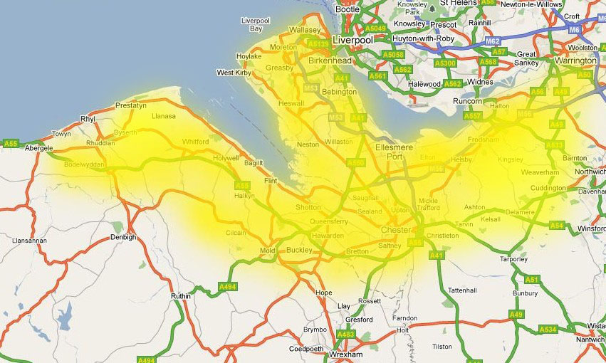We are a mixed hash providing for both runners and walkers. Our pack size is usually between 10 and 20. We generally run anywhere on the Wirral or within 20 miles or so of Chester, including NE Wales - see the map below for our nominal run area. The trail, which is marked in flour, generally takes between sixty to ninety minutes. The run is followed up with the usual circle and down-downs and then usually the pub. Hash fees are £1.00 for adults, free for children. If you haven't run with us before your first hash is free. Forewarn us if you like, but there's really no need: just turn up.