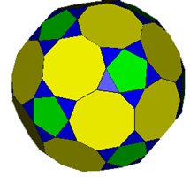 The above convex polyhedron with icosahedral symmetry contains examples of the unsolved 9-9-3 and 9-3-5-3 acrons (see 'acrohedra'). The enneagons are regular, but the pentagon edge lengths are around 1.2, making it a rather 'far miss'. Stress Map. Distortion (E=12.1, P=18.6, A=1657°). Discoverer: Robert Webb 2006.