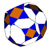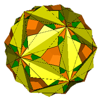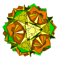 As something of an aside, above are two facetings of Ulrich's 9-9-3 near miss acrohedron. The left image shows a rhombified faceting containing enneagrams {9/2}, pentagrams and square faces. The right image shows a rhombified faceting containing great-enneagrams {9/4}, pentagons and square faces.