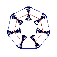 The diagrams shown below are of the equatorial edges with square edges in light blue and triangular edges in dark blue. The projection of the base vertices onto the equatorial plane are shown in red. Clicking on the diagrams leads to the 'hemi' models. The 'toroid' links lead to the toroids formed by superposing an endo and an exo model and removing the heptagonal bases.
