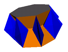 Repeating the exercise of inserting triangles gives the possibility of two polyhedra. The triangular faces may either extend outwards from the base polygon - in which case the square faces tend to face inwards (an 'exo' edge bi-expanded bi-prism) or the triangular faces can face inwards - in which case the square faces tend to face outwards (an 'endo' edge bi-expanded bi-prism). The equatorial polygons are now no longer regular; this is the reason why two prisms are used rather than one. Reflecting the prism through the equatorial plane allow for closure of these non-regular polygons.