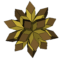 There are also a number of qualifying polyhedra which are monorhombic (i.e. face transitive on all faces), these are discussed on my page "Isohedral Rhombohedra". In a number of cases these were formed by relaxing the duals of uniform polyhedra with tetravalent vertices.