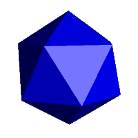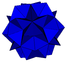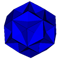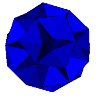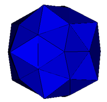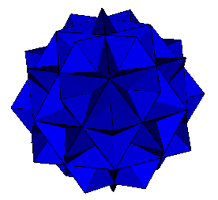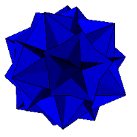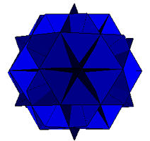 ** The deltahedron derived from the great truncated icosahedron dual superficially resembles great icosahedron but each icosahedral face contains three coplanar triangles.