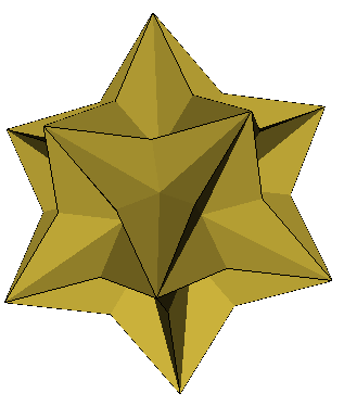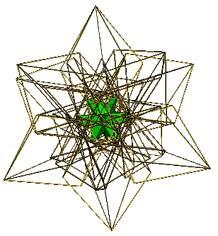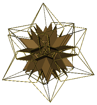 The above figure is the great rhombic enneacontahedron (VRML, OFF). In common with the rhombic enneacontahedron, it consists of sixty fat rhombi ('R') (gold coloured) as found in the rhombic dodecahedron and thirty thin rhombi ('r') (bronze coloured) as found in the medial rhombic triacontahedron. It is isomorphous to the rhombic enneacontahedron. The thin rhombi are all hidden within the figure. The right image above shows the figure with the fat rhombi as frames and the thin rhombi solid.