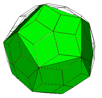The rhombic enneacontahedron can be faceted to form a dodecahedron by taking the long diagonal of the thin rhombi (above left). The short diagonals of the thin rhombi in the great rhombic enneacontahedron form a great stellated dodecahedron (above right).
