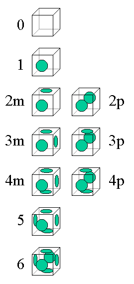A feature of the above isomorphs to the rhombicuboctahedron is that they illustrate the ten distinct ways in which a cube can be coloured using two colours for the faces, as shown in the diagram below. The plain faces relate to everted cupolae and the faces with green blobs to inverted cupolae.